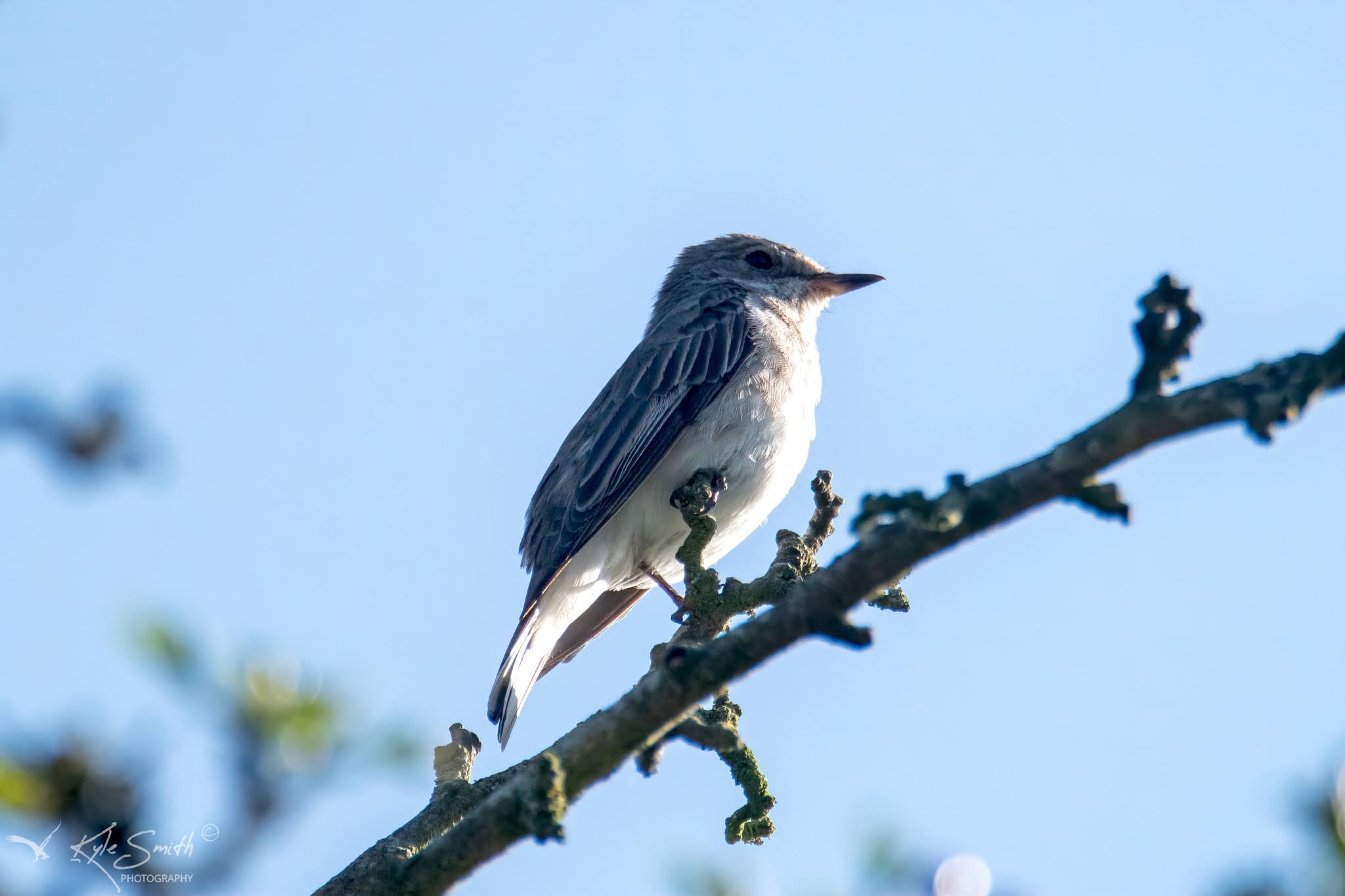 Back at work for a full week and so I found myself more restricted in popping out for a spot of birding. Despite this, a report from Dylan Parry-Davies of spotted (and crucially) pied flycatchers at Wormleighton spurred me to action. I finished at work promptly and shot off there "on the way home". I was joined by Kevin Heath who was already out and about at Balscote Quarry. In only a few steps we found our first couple of spotted flycatchers on overhead wires and atop a tree. I took a couple of photos, but the light was quite harsh and much of the time the birds were in silhouette. We circled round to get views from the other side.